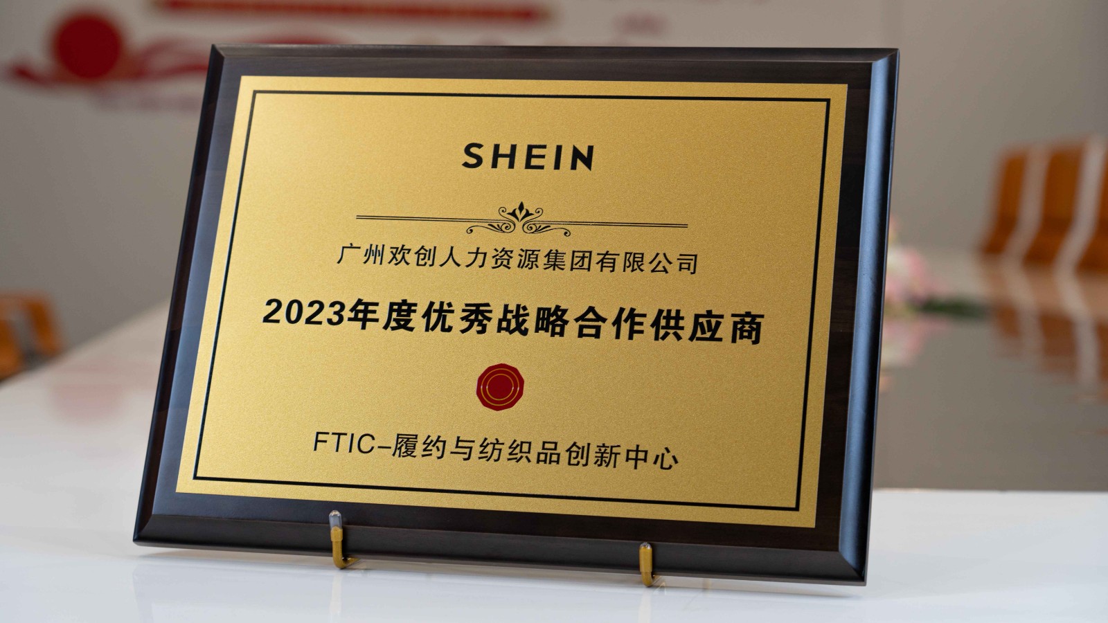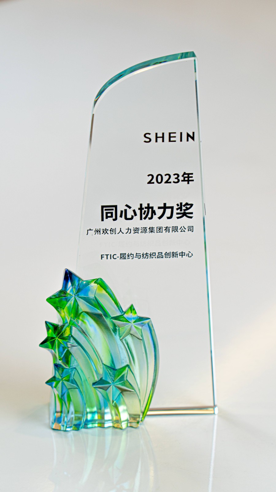 1月19日,在SHEIN(希音)供应商大会上,欢创集团被授予“2023年度优秀战略合作供应商”和“2023年同心协力奖”两项奖项。蓝领事业部总监李健荣代表集团接受牌匾。